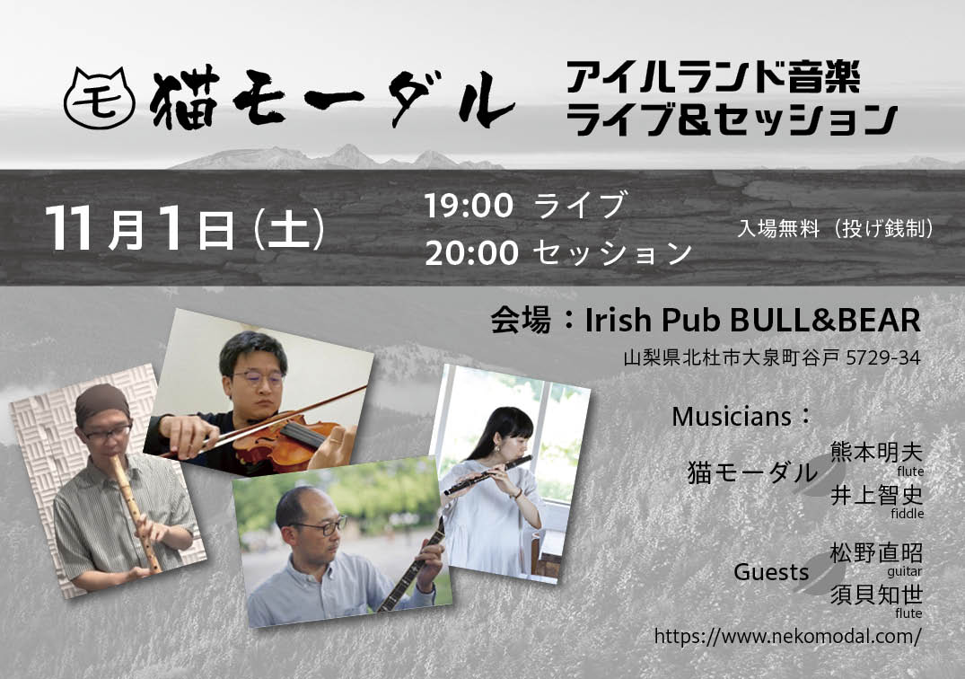 日時: 2025/11/1(土) 場所: Irish Pub BULL & BEAR(山梨県北杜市) 19:00 開演 20:00 セッション ゲスト: 松野直昭(guitar) 須貝知世 (flute) Facebook イベントページ https://www.facebook.com/events/1509737196703610