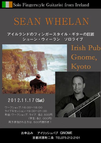 ダブリンのギタリスト、Seán Whelanさんが、11月上旬にかけて来日されます。Seánさんは元NightnoiseのフルーターBrian Dunning氏のユニットPuck Fairでの活動や、日本のシンガーソングライターKOKIAさんの録音への参加でも知られるギタリストです。以前にも何度か来日されていて京都のセッションにも顔を出されていますが、本当に素晴らしいギターを弾かれます。