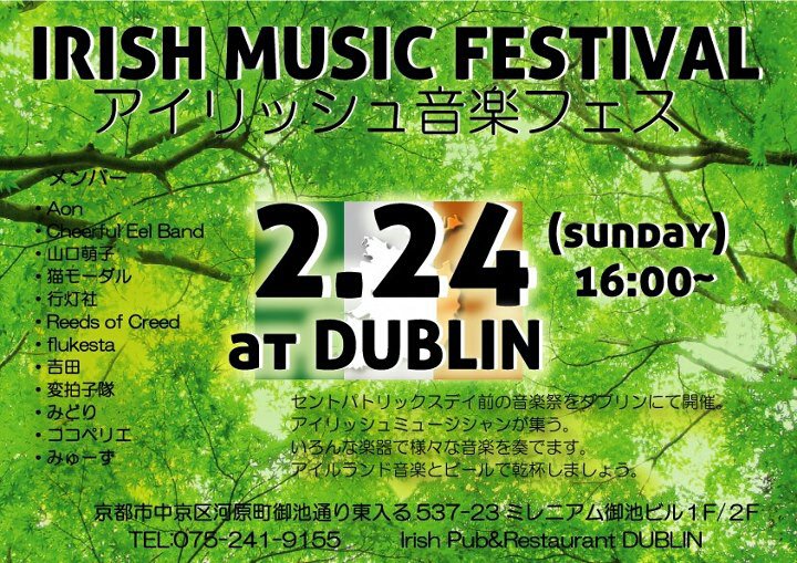 3月のセントパトリックスデーに向けたプレイベントへの出演が決まりました。関西圏のアイルランド音楽方面12ユニットによる投げ銭制ライブです。合間にセッション時間もありますので楽器をお持ちの方も気軽にお越しください!